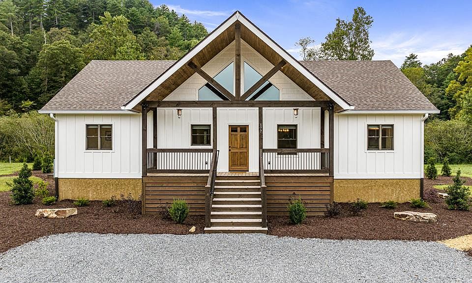 Discover the epitome of North Georgia mountain living- a beautifully crafted new construction farmhouse nestled on 3 level and usable acres with roughly 360 feet of rushing CREEK frontage along the scenic Conasauga Creek. This 2 bedroom 2 bathroom residence is conveniently located less than 15 minutes from Downtown Ellijay and offers one level living at its finest. This charming farmhouse boasts an open concept with soaring vaulted ceilings. The kitchen is a true focal point with a large island, granite countertops, custom cabinetry, and stainless steel appliances. The expansive great room features a rustic wood fireplace, a wall of fixed glass windows overlooking the creek, and a built-in office space all flowing seamlessly to an oversized screened in porch where you can relax and listen to the sounds of the creek just feet away and take in the views of the pastures. Retreat to the spacious primary suite with windows that overlook the creek. Enjoy a large walk-in closet, tile shower, double vanity, as well as a sit down vanity. The guest bedroom features its own walk-in closet with an adjacent bathroom featuring a tub shower. For storage purposes this home has roughly an 8ft high crawl space that is climate controlled- making it ideal for storage. This home is truly one of a kind and such a rare find! Professional photos show a model home- the subject property is not furnished or landscaped. Additional photos are attached to show the newly completed home.