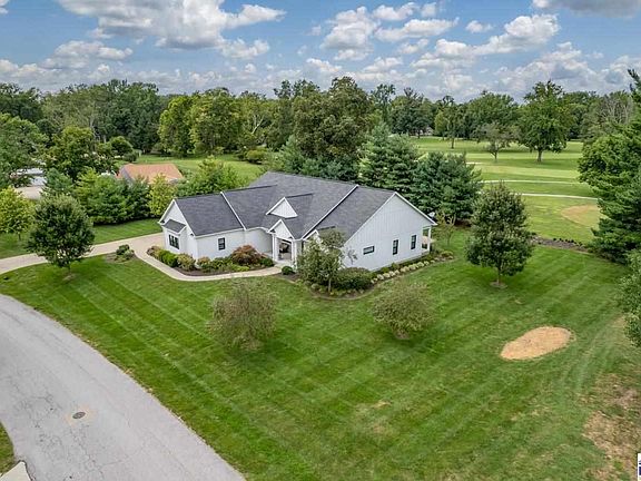 Nestled along Hole 6 of the Country Club golf course, this custom-built 2016 ranch is the definition of refined living. The curb appeal is striking with a fully irrigated lawn, wide drive, and a stunning covered front porch that sets the tone for what’s inside. Step through the elegant foyer into an open concept layout adorned with beautiful trims, moldings, and breathtaking views of the greens. The living room welcomes natural light with a tray ceiling and a cozy gas log fireplace. The kitchen is a chef’s dream with a modern aesthetic, featuring sleek open shelving, rich dark quartz countertops, stainless steel appliances, a walk-in pantry, and generous bar seating. The formal dining area flows seamlessly for easy entertaining. The split floor plan ensures privacy, with two bedrooms sharing a beautifully tiled walk-in shower bathroom, while a third guest suite includes its own en-suite and walk-in closet. The primary suite is a true retreat, complete with tray ceilings, patio access, an expansive walk-in closet, and a spa-inspired en-suite bath. The laundry room offers abundant cabinetry and counter space, and the oversized garage includes room for a golf cart. Evenings are best spent fireside under the open sky, watching sunsets over the fairway just steps from your back door. This property offers luxury, privacy, and effortless beauty in one of Terre Haute’s most sought-after golf communities.