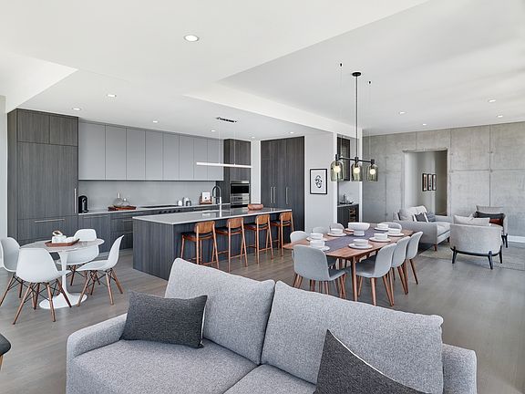 - Exterior features: Acoustical enhanced glass, Availability 24 Hours, Bicycle storage, Business Center, Clean air HVAC Ionizers, Concierge, Dark wood-grained flooring, Exposed concrete ceilings, Free Weights, Grohe and American Standard fixtures, Group Excercise, High-speed Internet Ready, Matte gray and white cabinetry, Media/game room, On-Site Maintenance, On-Site Management, Outdoor dining areas with stainless steel BBQs, Package Receiving, Prep kitchen, Private outdoor dog run & spa, Quartz countertops, Roller shades, Short Term Lease, Stainless steel appliances, Sundeck, Touchless experience, Undercabinet lighting