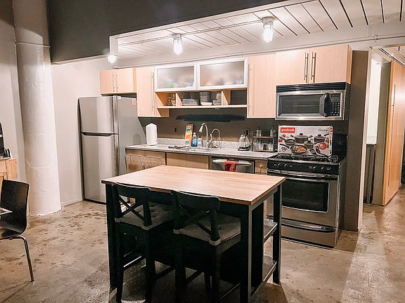Welcome to your urban oasis in the heart of Columbus! This stunning furnished condo boasts a modern industrial aesthetic, featuring exposed brick walls, cement flooring, and large windows that flood the space with natural light and offer picturesque garden views. This is available unfurnished as well for a smaller rate.