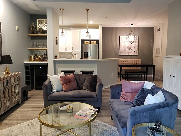 Beautifully renovated, open concept, 1 BDR / 1 Bath apartment, located in a quiet community, lined with gorgeous live oaks. Near the Stono River, with lots of natural spaces and tons of amenities! Modern, luxury touches throughout, including wet bar with wine fridge, custom butcher block shelving, floor-to-ceiling tiled rainfall shower, walk-in closet with custom closet system, stainless steel appliances, french door refrigerator with water dispenser, upgraded 48" kitchen cabinets, marble backsplash, LVP flooring, ceiling fans and more. Enjoy being on the top floor with elevated ceilings, tray ceiling detail in the living room, and a spacious 98sf balcony nestled amongst the trees. New HVAC system that is energy efficient and includes Nest controls to help manage your electric bill. Rent includes a parking pass, water/sewer, onsite trash and great community amenities such as fitness center, pool, heated spa, dog walk area, clubhouse and grill / picnic facilities. Easy drive to downtown Charleston, James Island, Folly Beach and Kiawah. We are pet owners and animal lovers, so well-behaved pets that meet community guidelines are welcome with a non-refundable pet deposit and additional monthly fee. Note that apartment is unfurnished; photos with furniture staging are for illustration only.