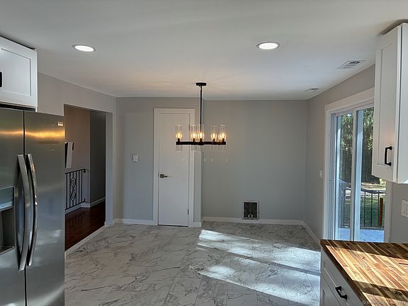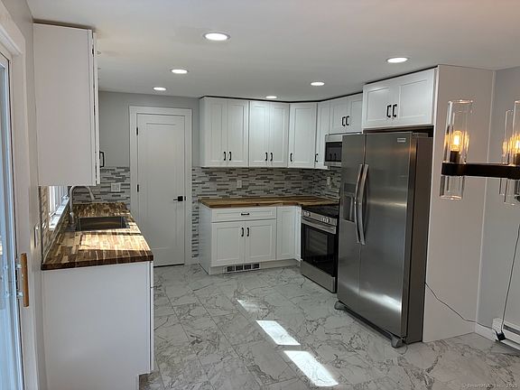 Beautiful raise ranch 3 bedroom with 2 full baths. New kitchen on the the main floor with new cabinets, lighting, appliances and tile floor which walks out onto the back patio. Master bedroom has a 1/2 bath. Main bath is newly renovated with tile, vanity and toilet. The upper level has hardwood floors throughout. The lower level has a new full kitchen with new appliances and new tile throughout. The lower level also has a fireplace and new recessed lighting. Full laundry room in the lower level with a new water heater. Large 2 car garage. House has a new roof with most of the plywood being replaced underneath. It also has a new heat pump system for central air and heat on the upper level. The lower level is electric heat. House is located at the end of a cul-de-sac in the east mountain section of waterbury. Easy access to I 84 and shopping. Wendell cross grammar school is minutes away. Spacious yard with large driveway surrounded by privacy.