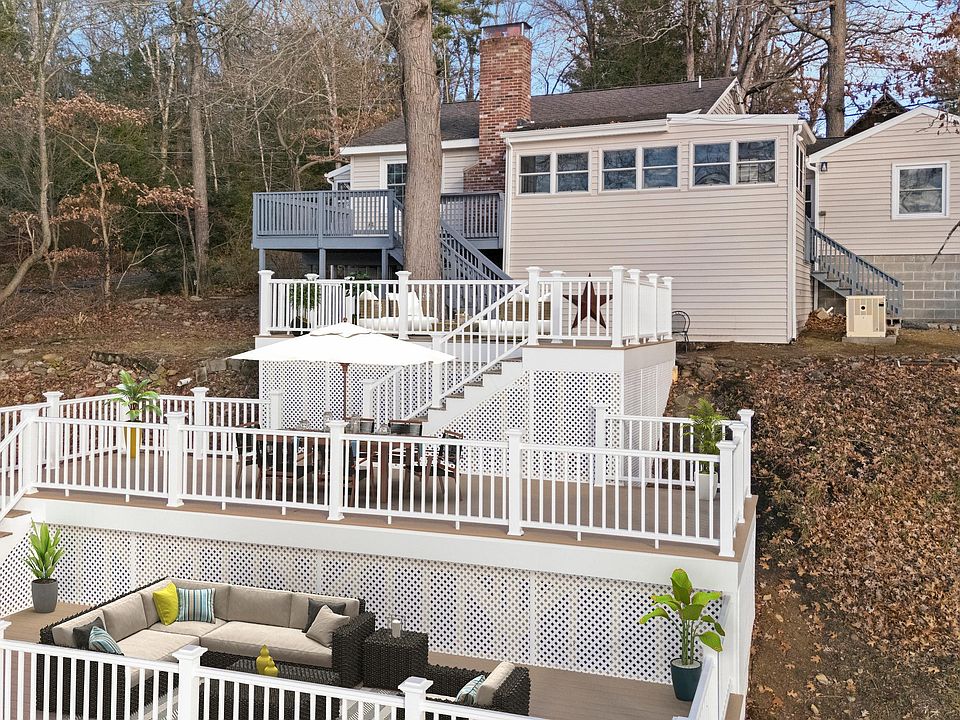 Brand-new multi-level TimberTech decks spanning roughly 800 square feet anchor the back of this fully furnished and beautifully renovated lakeside home on private Witches Woods Lake, creating an expansive outdoor haven for hosting, unwinding, and breathing in the calm of true waterfront living. With expansive views and direct frontage, the home has been thoughtfully updated in recent years with a modern granite kitchen, stainless appliances, updated flooring on the lower level, new septic system, and new mini-split heating and cooling systems for year-round comfort. The main level offers an easy flow between the kitchen, dining area, and living room, along with two comfortable bedrooms and a refreshed full bath. A sun-filled enclosed porch extends the living space and opens directly to the new decks, creating simple indoor-outdoor connection throughout the seasons. The walk-out lower level adds versatility with a spacious recreation room that could function as an additional bedroom, a second full bath with laundry, and direct access to the yard and shoreline. A one-car garage, breezeway, and multiple storage areas add everyday convenience. With kayaking, swimming, boating, and lakeside quiet just steps from your door- and with every major improvement already complete- this is peaceful, uncomplicated waterfront living where everything just feels easier. Floorplans available by request.