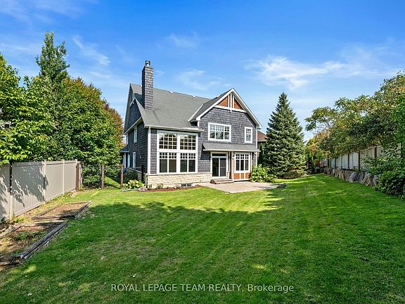 Welcome to this exquisite Craftsman-style executive residence, gracefully positioned on a quiet crescent in prestigious Kanata Lakes. Set on a large corner pie-shaped lot w/timeless curb appeal, a charming covered front porch, & a family-friendly setting just minutes from Beaver Pond trails & top-ranked schools, this home blends classic character w/refined modern updates. The main level showcases a tiled foyer w/French drs, a beautifully renovated powder room, & elegant LR & DR enhanced by refinished HW flooring, stone accents, & crown moulding. At the heart of the home, the dramatic two-storey FR is framed by a Juliet balcony above & a striking WETT-certified wood-burning FP w/floor-to-ceiling stone surround. The thoughtfully updated kitchen offers quartz counters, herringbone backsplash, peninsula w/bar seating & sink, island w/double sink, SS appl, & a bright breakfast area w/access to the landscaped rear yard. A sophisticated main-floor den w/custom wood built-ins & shutters provides the perfect executive office or retreat. The second level presents a true 5-bdrm layout, including a luxurious primary suite w/transom ceiling, WIC, & spa-inspired ensuite w/dbl sinks, soaker tub, & slate shower w/rain head. The renovated main bath completes this floor. The finished LL extends the living space w/a rec rm, dbl-dr flex/gym, private bdrm w/3-pc bath, & a spacious laundry rm. Outdoors, the fully fenced yard features an interlock patio, mature fruit trees, & generous play space. Extensive updates include int painting (2025), patio door replaced (2025), kitchen flooring & cabinetry (2024), main floor bath (2024) ensuite & bath vanity & lighting (2024), exterior paint (2024), & landscaping/driveway (2022), furnace (2021), washer/dryer (2021), A/C (2018), roofing updates by previous owner (2018). Security system is owned. A rare offering combining elegance, warmth & location. 24 hrs irrev. on all offers. Some photos virtually staged.