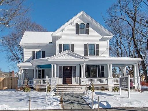Opportunity to own one of Needham's most beautiful historic homes. This spectacular Victorian farmhouse was built in 1871 for Judge Emery Grover. This home underwent an impeccable restoration/addition and has been restored to pristine condition with all of the modern amenities of today. Located in Needham Center, short walk to train & many options for excellent restaurants and shops. Features include wrap around front porch, original stained glass windows, wide plank floors on main level, chef's kitchen with quartz counter tops, master bath skylight with heated floors and custom closets. 5 bedrooms, 4&1/2 baths, open floor plan, third floor au pair/in-law suite. This in-town home with it's own fenced in private yard and 2 car garage, shares a double sized lot with another stunning new construction Victorian.