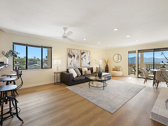 Perfect for owner use as a Tiburon pied-a-terre with expansive panoramic views over the Belvedere Lagoon to Sausalito, Strawberry, and the GGNRA. This stunning Marinero Heights two bedroom, two and a half bath townhouse offers approximately 1456 square feet of livable space and an oversized private storage room located in front of parking space. The upper level features a spacious living room/dining room with gas fireplace and deck, half bathroom and beautiful kitchen with counter bar. The entry level is highlighted by a primary suite with beautiful views, plus a second bedroom and full bath. A full-size almost new washer and dryer in the hallway closet add convenience and new refrigerator and microwave. All wood flooring, so no carpeting at all, and the unit is freshly painted. Everything is immaculate! One covered parking space and guest parking. Located in a pod of only four townhomes on one driveway. There is a pool located below the guest parking. Conveniently close to Reed School and Del Mar, ferry commute to San Francisco, picturesque Downtown Tiburon and the nature trails along the water.
