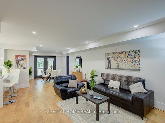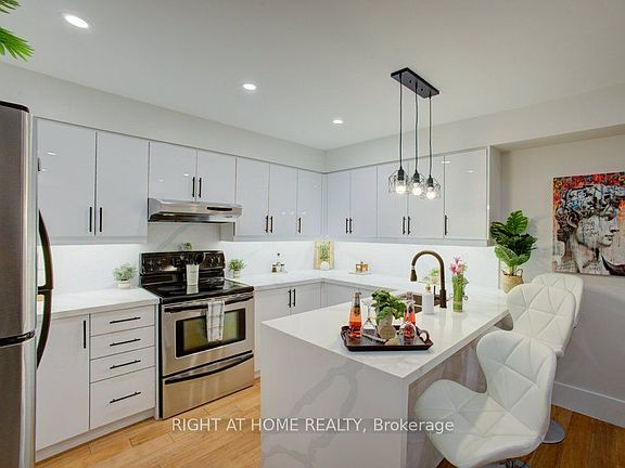 Recently updated kitchenRefaced cabinetsQuartz waterfall countertopQuartz backsplashNew pot lightsPendant lightingOpen concept floor plan