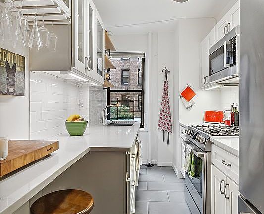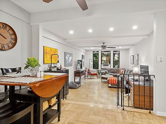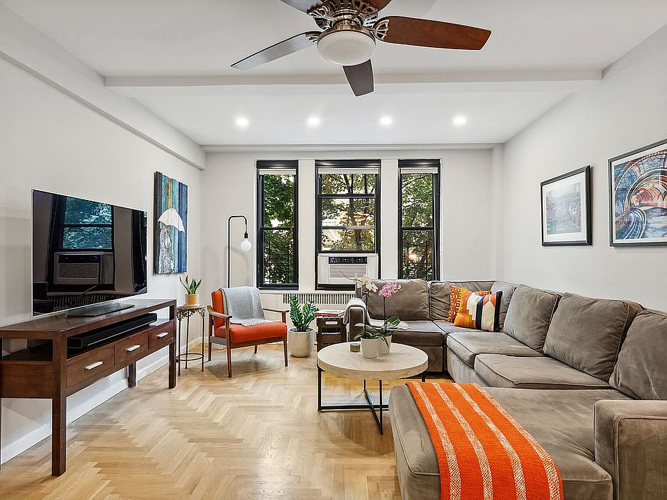 Lighted closet interiors, ceiling fans in all rooms, an adorable built-in nook in the hallway, high beamed ceilings framing the sunken living room and lush tree views from every room complete the picture. Inwood’s Park Terrace section is like nowhere else in Manhattan; this home epitomizes the understated elegance and calm that attracts so many New Yorkers to this charming neighborhood.