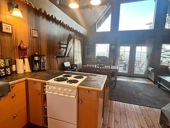 Cozy wood-burning stoveForced-air heatSolid wood floorsImported wood wallsCustom cabinetrySlate countertops