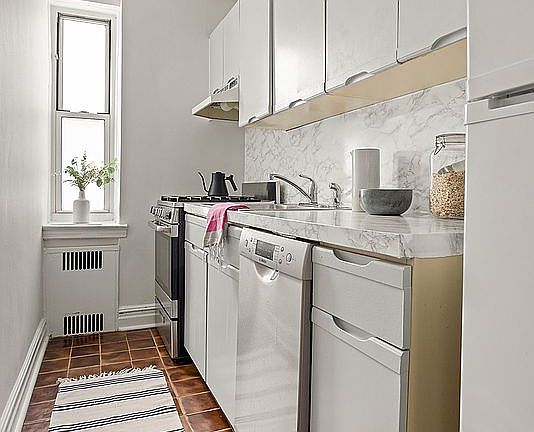 The windowed galley kitchen has been updated with a sleek stainless-steel stove, painted cabinets, and a dishwasher, and it offers excellent cabinet storage. The beautifully renovated, windowed bathroom features classic subway tiles, a deep soaking tub and waterfall showerhead– perfect for unwinding at the end of the day.