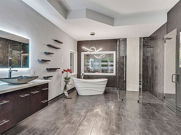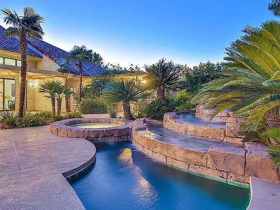 Gorgeous newly remodeled estate located on a sprawling half-acre interior lot in the iconic guard-gated Henderson neighborhood of Quail Ridge. Conveniently located with close proximity to the airport, shopping, and all that Green Valley has to offer. With six total bedrooms, an oversized three car garage with large driveway, an office, open kitchen, and large bar in the great room, there is no shortage of entertainment options. Three of the bedrooms are located on the first level, one of which is a sprawling primary suite with dual walk in closets and a private patio with outdoor hot tub. The additional rooms boast balconies share a loft area on the second floor. Soaring ceilings, combined with a mid-century modern vibe and lush landscaping make this home truly one-of-a-kind.