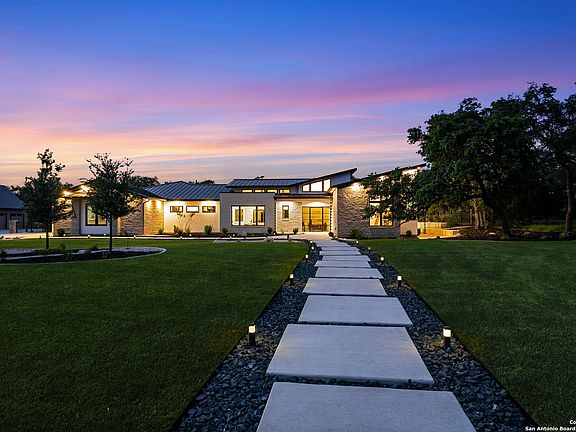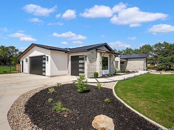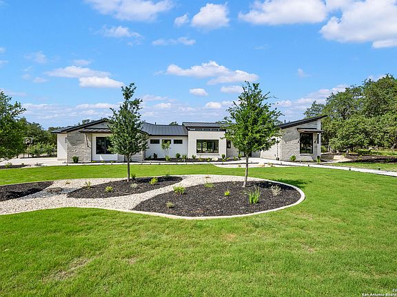A showcase of exquisite taste, this beautiful single-story home is situated on 1.07 park-like acres. The home boasts fine lines fused with contemporary finishes and textures. The curb appeal immediately sets the tone for this pristine property and with every turn the beauty and serene ambiance continues to unveil itself. The dynamic entry features a striking iron and glass pivot door and walls of grey infused stacked stone. Natural light floods the interior, which boasts walls of framed seamless glass windows and transoms, soaring ceilings, accent lighting and a blend of textures, such as wood, steel, glass and stone. The great room is truly the heart of the home and is ideal for gatherings on any scale. A wall of retractable doors open to the superb outdoor living areas and transforms the room into your very own resort style oasis. Additional details include a vaulted beamed ceiling, a beautiful wood accent wall and a sleek fireplace with vibrant lighting. Bordering this space is a dining area with an adjacent wet bar complete with a sitting bar, beverage and wine refrigerator, ice maker and ample space for the mixologist to create crafty drinks and mocktails! Sure to impress the keenest of chefs, the kitchen features all the quintessential needs for preparing your favorite meals. Appointments include a vast cascading island with a sitting bar, stainless steel Monogram appliances, a 6 burner gas range with a griddle, dual ovens and accent knob lighting, microwave drawer, dishwasher, built-in side by side refrigerator and freezer and striking matte black backsplashes. The cozy breakfast nook offers an elevated U-style seating booth and is also the perfect space for game nights! An escape from the ordinary, the owner's wing is equally as impressive with its wall of retractable doors that opens to a covered patio and soothing tones. For a full spa experience the bathroom is enhanced with separate vanities, free standing tub with sleek hardware and an oversized walk-in shower with detailed tile accents and multiple shower and rain shower heads. Completing the bathroom are two boutique style wardrobe rooms with custom finishes and one of the rooms offers access to the utility room. Three additional bedroom suites, an exercise/flex room and a well-designed mudroom complete the impressive interior. The inspirational backyard is ideal for year-round al fresco relaxation. The sprawling covered patio features a wood burning fireplace and multiple living and dining spaces - your entertaining options are endless! The sparkling pool is the centerpiece of the backyard. Details include a lounging deck, adjoining spa, two tranquil spillways and a sleek fire feature that provides an illuminating ambiance at night! The grill master will appreciate the outdoor kitchen that boasts a stainless-steel Coyote grill and beverage cooler, storage drawers for utensils, food station and trash bins. The unique kitchen also includes a swim-up pool bar with stools for ease of serving with your family and friends. The park-like grounds, towering mature tree canopies and sprawling lawns offer multiple areas for leisure and play. This superb property will surpass your expectations of true hill country living and offers easy access to Interstate 10 and downtown Boerne.