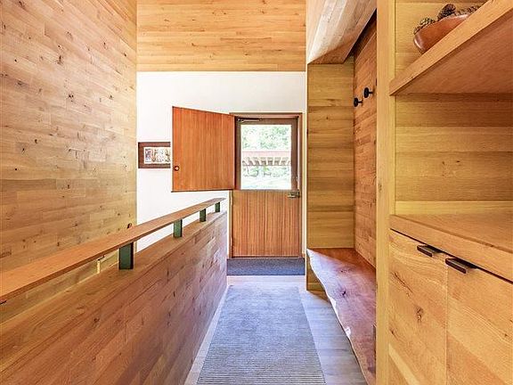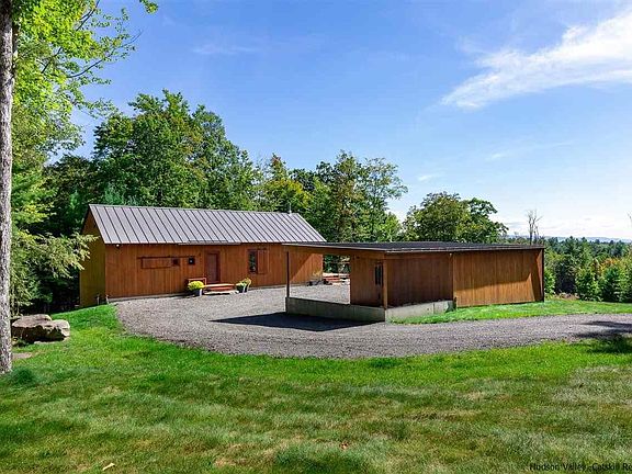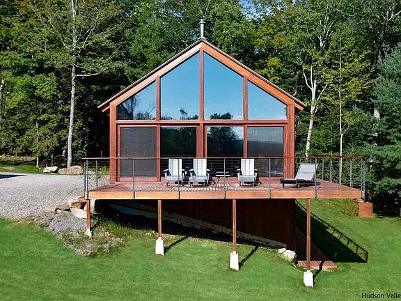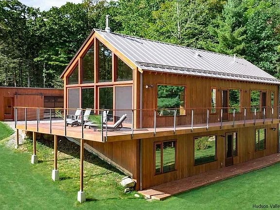 Enjoy smart living in this handcrafted architect-designed modern cabin in sold-out Hudson Woods. Sited on 3.3 landscaped acres with mountaintop views, garage and carport, every need and want have been anticipated with significant upgrades and technological conveniences. Walls of glass face the view and bring the outside in, visually expanding the comfortable and spacious interior. Extensive use of white oak on floors, walls, ceilings and cabinetry offers a rustic counterpoint to the modern aesthetic, and is especially evident in the dramatic entry hall with its artfully designed storage wall. The open kitchen, with a dazzling blue tiled backsplash, is outfitted with Miele, Sub-Zero and Smeg appliances, concrete countertops and custom Bulthaup island and pantry. A Wittus wood stove in the great room augments the radiant floor heating, and central air throughout keeps things cool in warmer months. Bedrooms are spacious and include intelligently fitted closets, and bathrooms are spa-chic, with a deep soaking tub in the primary suite. There are handcrafted finishes throughout, including custom door and window hardware, luxe lighting fixtures and thoughtfully designed window treatments. Wide cedar decking wraps around two sides of the home and is accessed by tall sliders from the living/dining area, allowing for delightful warm-weather entertaining, while the lower-level great room and bedrooms open to another deck that runs the length of the house. Multiple outdoor areas offer a setting for every mood, be it the desire to bask in the sun or enjoy a bit of quiet in the shade of tall trees. Nest system controls multi-zone heating and a full-house Lutron lighting system offers remote activation. All systems are high-efficiency, state-of-the art and require minimal maintenance and care. Nearby points of interest include Mohonk Preserve, Minnewaska State Park, Westwind Orchard, Arrowwood Farms & Brewery the new Inness hotel, restaurant and club, and the Kingston Arts District.