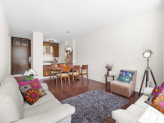 This 2 bed 2 bath east facing residence features an entry foyer, floor to ceiling windows, Brazilian cherry hardwood floors, courtyard & open eastern city views, in unit washer & dryer, stunning open kitchen with Blizzard Quartzite countertops, and premium appliances. The unit features more than ample closet space with a walk-in closet in the primary bedroom and 4 large closets in total; en suite bathroom has Bianco Dolomite marble vanity and both full stand up separate shower and deep soaking in tub. The secondary bathroom features custom crackle porcelain or glass tile, brushed nickel Waterworks fittings.