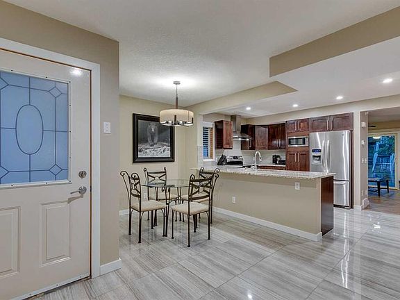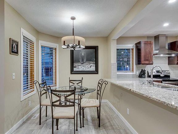 Absolutely spectacular! One of the best locations in Inglewood adjacent to the bike path and Bow River. Massive, custom renovation top to bottom! Corner end unit with a double attached garage will fit a full sized vehicle plus a shorter vehicle. South and west facing means tons of sunlight! 3 bedroom, 2.5 baths, over 2000 square feet of total developed living space. High end TRIPLE pane windows that fully open at a 90 degree angle from Centra (Supreme Windows). The patio door and basement windows are also triple pane. High gloss 12"x24" tile flooring in the entrance, main bath, kitchen, dining room, and upstairs bathrooms. Gorgeous kitchen with thick granite countertops with rounded corners, large eating ledge, undermount sink with soap dispenser, custom pull out drawer system, stainless steel dropped hoodfan with tile backsplash to the ceiling, built in wall microwave, stainless steel appliances including an ultra quiet dishwasher, flat top stove, french door fridge with pull out bottom freezer with ice/water dispenser, stained maple cabinets with soft close doors and 9" chrome handles. Pot lights in kitchen, entrance and upstairs hallway. Knockdown ceilings on entire main floor except the half bath which is a flat drywall ceiling. Massive sized living room has hardwood inspired tile flooring, ceiling fan with remote, and custom floor to ceiling stonework around the gas fireplace with internal blower fan. Feature accent lighting installed on the stonework. Large windows in the living room with a sliding door, leading to a large 8'x16'2" west facing deck with a natural gas line. Upstairs has 3 bedrooms including a large master, ceiling fan with remote, and a huge walk in closet measuring 8'x6'6". Both the ensuite and the second bathroom have the same granite, cabinets, undermount sinks, and tile flooring as found in the kitchen. All bathrooms have high quality Kohler toilets with soft close lids. Bedrooms 2 and 3 have a custom double door closet. Bedroom 2 has ceiling fan with remote. Fully finished basement with huge rec room and family room has plush carpet with thick underlay. Large storage room with front loading red LG washer and dryer with pedestals. 3.5" tall baseboard casings throughout the house. Custom "Bungalow Beige" paint color throughout the house. 60 gallon hot water tank installed in 2022. 2.5" white faux wood blinds throughout the house. Driveway will hold a vehicle angle parked. Amazing views to the west of the massive trees. Outside stucco painted / refreshed in 2023. Front porch and rear deck is composite board material with white metal railings. The Inglewood Village On The Bow complex is very well run with a $3.1 million dollar reserve fund.