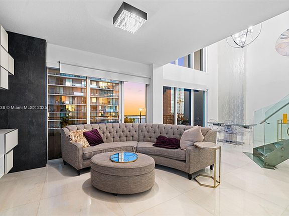 Welcome to this beautiful 2-Bed/3-Bath fully furnished loft-style residence at Infinity Brickell. Perched on the 46th floor, this home offers both volume and versatility, with double-height ceilings, floor-to-ceiling impact windows, creating a light-filled atmosphere and showcasing views of the city skyline and Bay. Spacious open-concept living and dining areas feature marble flooring throughout, custom glass staircase, and two private terraces that extend the living space outdoors. The primary suite offers a spa-like bath, while the lofted 2nd bedroom provides flexibility to serve as a guest room, office, or media lounge. Each of the bathrooms have been tastefully renovated. Full-service building with rooftop sundeck, jacuzzi, pool, gym, spa, party room, & 24/7 security. 1 parking.