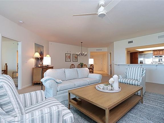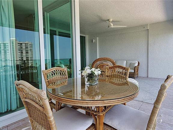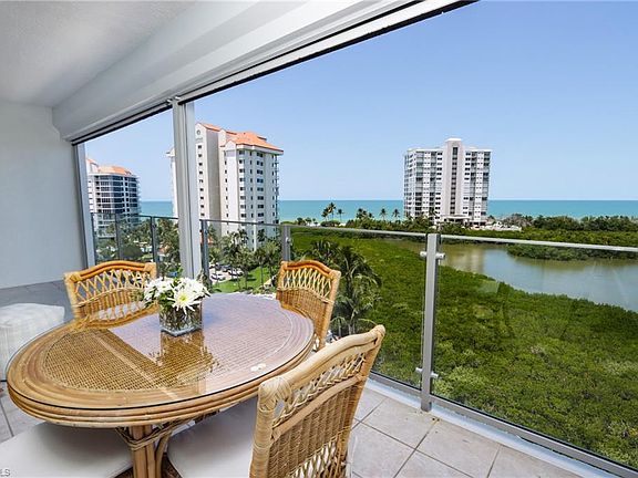 Gorgeous views from this 3 BDRM/3 BATH 7th floor condo with nine foot ceilings in Baypointe at Naples Cay. Two large Lanai's offering spectacular views of the Gulf and Clam Bay from the west lanai, and views of Venetian Bay and the city from the east lanai. Enjoy watching the birds and wildlife below on your expanded terrace, overlooking beautiful clam Bay and the Gulf of Mexico. This spacious (2,173 under air, 2,403 total square feet) condo is plush and comfortable. The master suites a king bed, TV and large On-suite. The two guest bedrooms offer a queen and daybed. The condo is ideal for entertaining with a table for 6 and plenty of dining area on the terrace. Enjoy the famous Florida sunsets in this luxury high rise after a day of relaxing by the pool, walking along the beach, or playing tennis. Other amenities include a spa, billiards room, executive conference room, guest suites, and a well-equipped and modern fitness room.