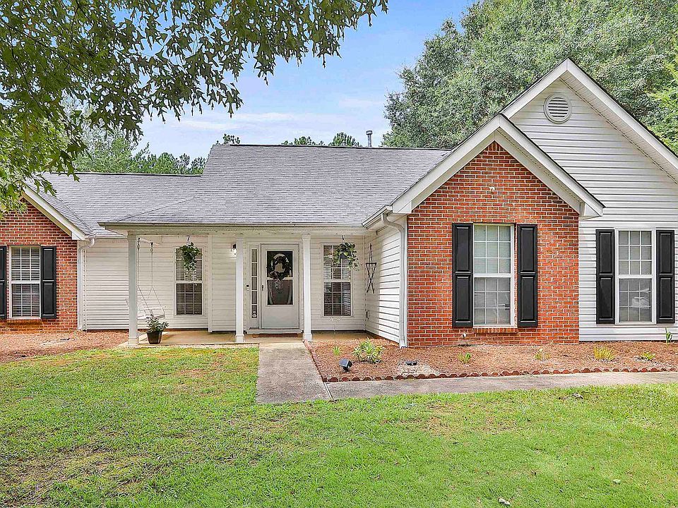 YOU ARE HOME once you step into this MOVE-IN READY Ranch in Sharpsburg! Fall in love with this light and bright open floor plan. The Vaulted Great Room offers a fireplace with gas logs. The Sun Room is situated directly off the Kitchen and Dining Area. This home boasts a wonderful Kitchen with large island, Granite Counter Tops, a full compliment of stainless steel appliances including a refrigerator, newer Gas Stove and newer Microwave. The split Bedroom Plan gives privacy for the Primary Bedroom that highlights a beautiful ship lap feature wall and barn door going into the bathroom. Also note two closets and a separate Tub and Shower along with a Vanity and knee space. The Laundry Room is situated off a private hallway with easy access to the two car garage with NEW garage door that has additional closet storage & extended parking pad. There are two additional bedrooms and full bath. Outside there's a custom built pergola gathering area on the large rear patio. Enjoy the roomy fenced backyard and the outside storage building. HVAC has been replaced, new lighting, new back door with storm door and custom touches throughout! NO CARPET. NO HOA. Pride of ownership shows in this adorable home!