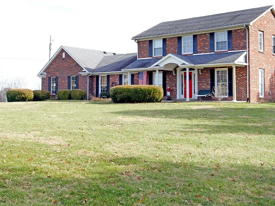 Location Indeed! Pristine 5+ acres just under 5 minutes from Versailles. Beautiful 2 story brick home, ready for gathering friends, neighbors and family. First floor has several cozy areas to choose from, all centrally located with kitchen that is fully equipped! Up are 3 large bedrooms, 2 full baths, nice closets. No carpet in home. 3 car attached garage, barn w/4 stalls (12X12) and 1 big mare/foal stall. Electric and water to barn, run-in shed, riding arena 120X140. Priced to move-Don't miss this one!!