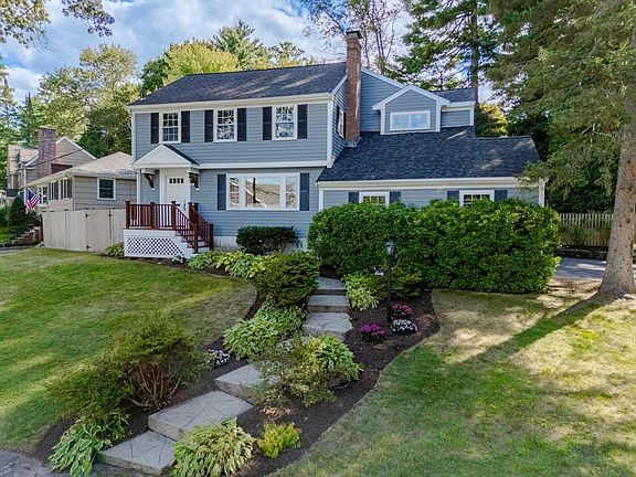 Beautifully landscaped colonial in a sought-after neighborhood overlooking Sutton Road. This spacious home features hardwood floors, a sun-filled living room with fireplace, and a freshly renovated eat-in kitchen with new quartz countertops and finishes. The formal dining room flows through French doors into a bright family room, while built-ins create the perfect home office space. Upstairs offers a large primary suite (over 550 sq. feet) with skylit dressing area, a large bathroom, and a sitting area with built-ins. There are three additional generously sized bedrooms. A partially finished basement, recently carpeted, offers extra living space or playroom. Enjoy a fenced backyard with patio and colorful gardens—perfect for entertaining. Walk to commuter rail, schools, shops, restaurants, and Defazio sports fields. This home is not to be missed!