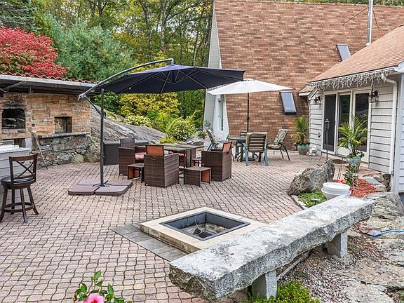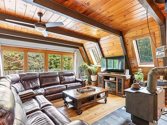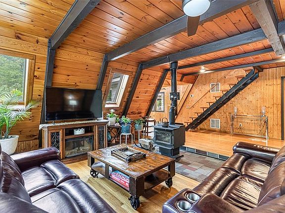 THE outdoorsy entertainer's retreat has hit the market. A charming and secluded haven - this woodsy contemporary home has everything you need for stellar backyard gatherings day or night. Just under an acre with a picturesque landscape, paved patio, outdoor grilling island with beverage cooler and two grills along with a brick oven - the outdoor area is impressive. The list goes on: sweet pergola, built in fire pit, outdoor storage port/container, chicken coop, sprinkler system, ample parking and more. Immersive wooded privacy and stunning natural ledge features are a feast for the eyes. Inside, this swanky extended 3 bed 2.1 bath A-Frame graces us with pine walls, hardwood floors, cathedral ceilings, skylights and multiple outdoor experiential access points to patios and balconies. Each bedroom flaunts a patio or balcony, as does the living room and kitchen. Cozy up by the wood stove in the living room. Enjoy a soak in the relaxing bathroom jet tub. A ravishing and bold kitchen checks all the boxes. Stainless steel appliances, beverage cooler, oversized island with a quartz waterfall countertop - indoor entertaining is fabulous, too! Additional boastful amenities include central air, finished basement with bar, 3 car garage, and newer Generac generator to cover the essentials. Didn't think your wishlist could be met? Welcome to the ultimate wishlist home of the season.