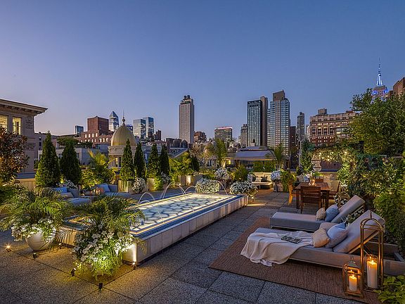 The penthouse’s private gardens are nothing short of extraordinary. Landscaped with intimate seating alcoves, a tranquil reflective pool, and sweeping vistas of the NY skyline & Empire State Building, they offer a rare opportunity to live amid nature and water in the heart of Manhattan’s cultural epicenter.