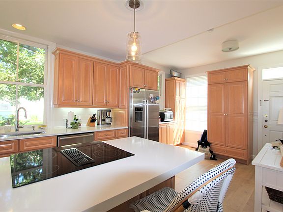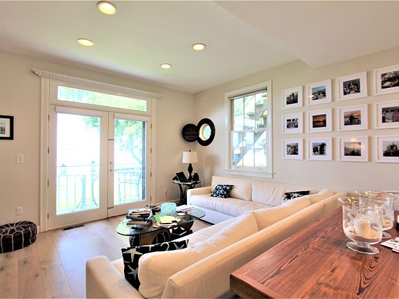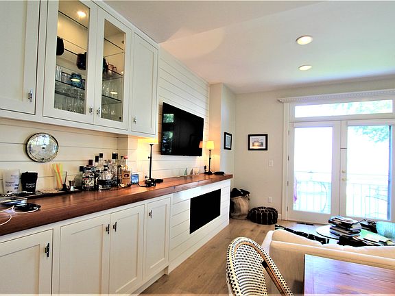 Island seatingGas fireplaceTasteful furnishingsNewer appliancesCustom cabinetsPrivate deckShiplap details