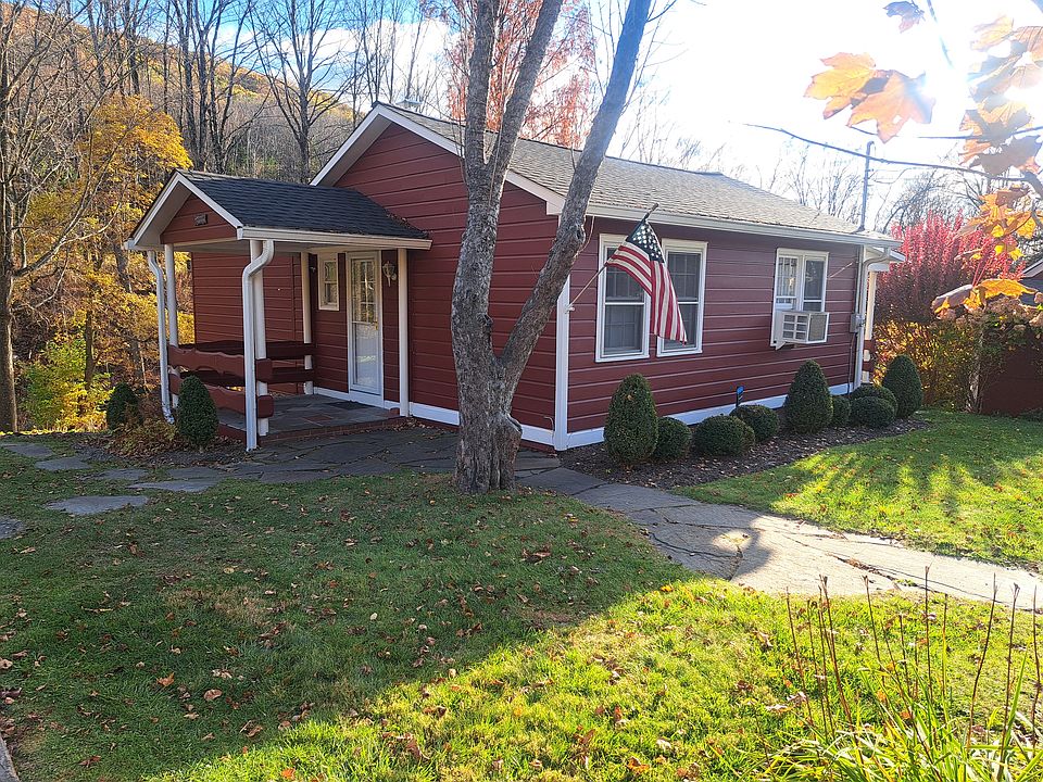 This beautiful rustic open concept 1 bed 1 1/2 bath sits with finished room and large ceader closet down stairs sits on a manicured landscaping you own private getaway retreat with large patio, fire pit, streem and mountain views. Includes Washer/Dryer perfect for the professional couple close to highway, 1hr to NYC