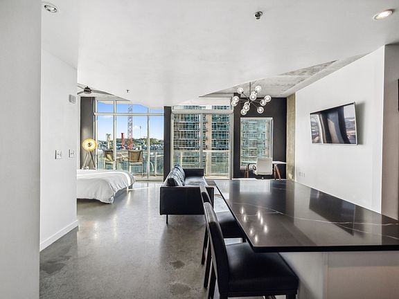 Set high above one of Nashville’s most dynamic districts, this condo blends open, modern design with panoramic skyline views. The kitchen, dining, and living areas connect seamlessly, framed by floor-to-ceiling windows that fill the home with natural light and overlook the city below.