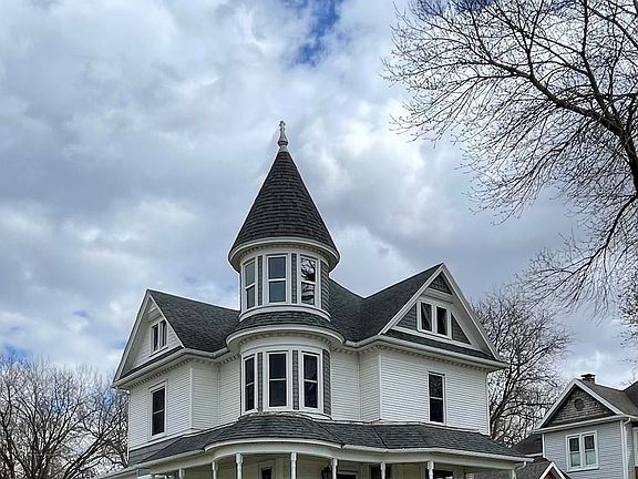 Updated Victorian 4 bedroom, 3 bathroom home nestled on a large corner lot. Newer kitchen, main floor laundry(with laundry chute from both upstairs bathrooms), beautiful wood floors, gorgeous built-ins and intricate staircase. The newly renovated turret adds so much character to this already beautiful home! 4 bedrooms upper level. Primary bedroom has LVP flooring, ensuite new full bath, and 2 closets. 3 other nice sized bedrooms with new carpet and another updated full bath. This home also offers a large yard, wrap around porch, garden area and oversized garage.