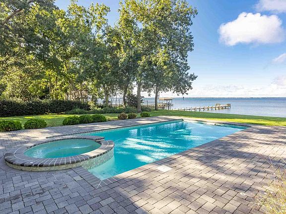 Luxurious and rare , this 5 bedroom, 5 bathroom home of 5,210 sq. ft. (including main home & above garage fully heated & cooled space) rests on the beautiful Pensacola Bay in the Bay Cliffs neighborhood in Gulf Breeze. Richly-appointed spaces include large gathering areas, a bright, professional-grade kitchen, spectacular dining area, 2 walk-out master suites, and prestigious study. The additional bedrooms and office are located upstairs all attached by an additional living room with access to a spacious patio with spectacular views. Contemporary amenities include a whole home generator and a central vacuum system. The expansive backyard includes a sparkling pool with a current machine, spa, and boat dock plus a beautifully tiled porch perfect for relaxing and entertaining. You