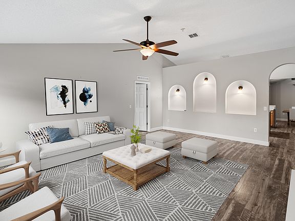 Move in ready 3/2 with flex space/office. Seller is motivated! Make this home your own starting with a metal roof installed 2022, 2018 AC, 2021 hot water heater, new convection oven, refrigerator, new windows and dishwasher as well as oversized washer and dryer stay with the home. No HOA. 2 car garage with extra long driveway for multiple cars. Yard is fenced with screened in lanai. Visit this home and envision how to make it your own. Shopping, parks, schools, beaches are all nearby.