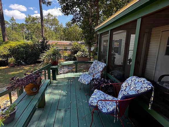 Private screened porchStylish wood plank flooringBright cheery living spacePrivate landscapingLarge yard
