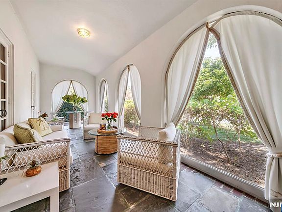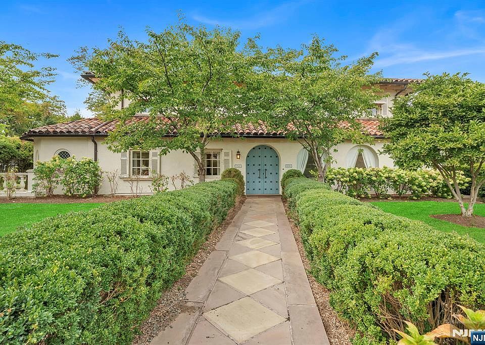 Built in 1927, this Spanish Colonial Revival estate offers 4,866 square feet of elegant living space on nearly half an acre in one of Glen Rock's most distinguished residential settings. Defined by its mission tile roof, arched entries, and original millwork, the home blends historic character with expansive interiors suited for modern living. High ceilings enhance every level, beginning with a grand living room with fireplace, a sunlit family room, and a front sitting area enclosed by a series of large arched windows. The formal dining room is crowned with architecturally detailed coffered ceilings, while a library with built-ins provides a refined retreat. A versatile kitchen with pantry and a well-placed powder room complete the main level. Multiple exits lead outdoors to a private side courtyard and to a patterned-paver driveway that extends to the detached three-car garage. The upper level offers five bedrooms and two full baths, with the primary bedroom serving as a serene focal point for the floor. The finished lower level expands the living space with a recreation hall, media lounge, custom wine cellar, full bath, laundry, and ample storage. Landscaped grounds and extensive hardscaping unify the exterior and reinforce the estate's architectural presence. This is a rare opportunity to own a residence of lasting quality and distinction in the heart of Glen Rock.