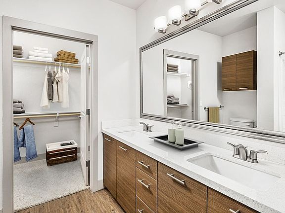 - Exterior features: , 9 ft. ceiling, Bathtub and shower combo, Breezeway storage included, Brushed nickel fixtures, Business Center, Carports, Ceramic tub/shower surrounds, Contemporary interior finishes, Corner apartment with double exposures, Courtyard, Cutting edge sound reduction technology, Dark gray shaker cabinets with 42" upper cabinets, Double-sink vanity, Fitness zone with flex workout studio, Flooring: Wood, Fourth Floor Apartment Home, Garages, Gray wood-style flooring, Kitchen island, Meeting rooms, Modern hardware in bathroom w/ large showerhead, Modern interior finishes, Modern woodgrain cabinets, Online Maintenance Requests, Online Rent Payment, Open concept floor plans, Outdoor Terrace, Parking, Pendant and track lighting, Pendant lighting in kitchen, Premier Location, Pull down spray faucet, Pull-down sprayer faucet, Recessed LED lighting throughout, Soaking tub, Solar Shades, Stainless steel appliances, Stand alone, glass enclosed shower, Stand-up shower, TV Lounge, Top floor, Townhome, USB outlets, Under cabinet lighting, Undermount sinks, White ceramic subway tile backsplash, White ceramic tile backsplash, White quartz countertops, Wi-Fi in common areas