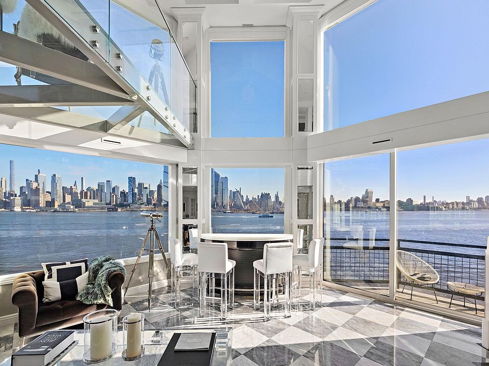 Stunningly unique 2-story penthouse in the sky with breathtaking panoramic NYC & Hudson River views! Step off your private elevator to see gorgeous south NYC views and a custom glass staircase with built-in wine storage. Walk into the heart of the home and be surrounded by the entire NYC skyline: this 2-story great room has a bar, custom fireplace, and balcony, while allowing you to see all the way from the George Washington Bridge to the Verrazano Bridge. Turn around and you’re in your spacious chef’s kitchen with white cabinetry and countertops, custom sink with instant hot water, oversized island and LaCornue stove with 8 burners and a pot filler.
