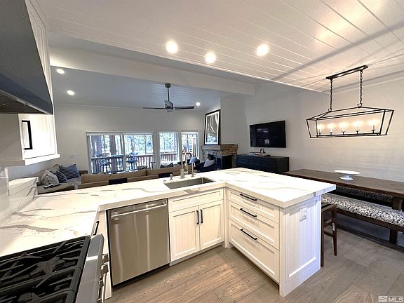 Fully remodeled 2 bedroom Lake Tahoe NV condo with peek of the lake and gated entrance. This desirable Pinewild unit is being sold furnished & features 2 main level bedrooms and a bright, open floor plan. The great room has a cozy fireplace, wood floors, high ceilings and western sun exposure. A gourmet kitchen awaits with breakfast bar, high-end appliances, all new cabinets and counter tops. Pinewild homeowners enjoy an expansive sandy beach, pier, tennis/pickle ball and clubhouse. Located in Zephyr Cove, on Tahoe's sunny east shore where an abundance of restaurants, world class skiing and the Edgewood resort are all conveniently within minutes. Nevada residents enjoy an excellent tax climate with no state income tax, no inheritance tax, comparably low property taxes and more.