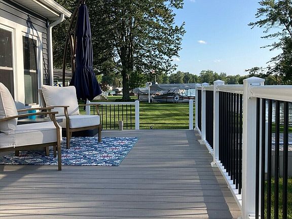 oversized master suite, laundry, and remodeled guest bath. The home sits as 1st home in on channel, with large decks and new sea wall, and an extra lot providing ample room for outdoor fun and entertaining. The 25x32 pole barn/garage has room for lake toys, 2 cars and extras, plus there are 2 sheds for extra storage, and pontoon & ski lifts for direct water access. Turnkey with house furnishings is possible, so act quickly and enjoy lake living this summer.