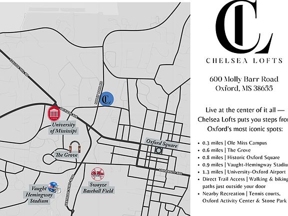 Live at the center of it all—steps from Ole Miss, The Grove, and the Oxford Square. This stunning Soho floor plan at Chelsea Lofts features 2 bedrooms, 2.5 baths, and a bonus room. Chelsea Lofts redefines prestige and modern luxury in Oxford, offering open-concept living, quartz countertops and backsplash, GE Caf appliances, and floor-to-ceiling cabinetry. Amenities include a club room, exercise room, and heated enclosed parking. With a prime location to walk to campus for game days and stroll to the Square for dinner, Chelsea Lofts delivers the best of Oxford living. Taxes and HOA fees TBD