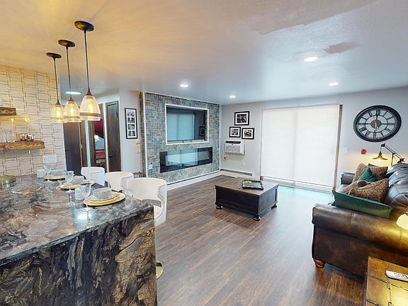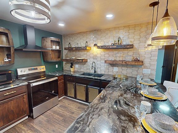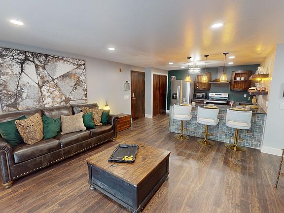 Our Speakeasy unit is the height of decadence, luxury and custom design. Our kitchen includes an upgraded appliance package with a large fridge with ice maker and water dispenser, the aforementioned waterfall island granite that extends to the floor. The backsplash has a 1920s specialized gold inlay pattern tile with custom crafted wood hewn shelving that are the utmost in 1920s opulence. New dishwasher, stove, microwave, modern open hood range for cooking.