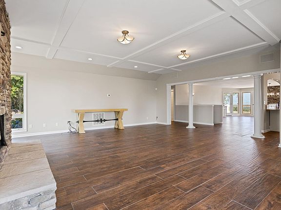 Stone fireplaceStone stepsMassive deckTwo car garageGrassy front lawnOversized covered front porchWalkout lower level