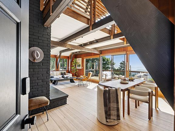 Rare architecturally striking A-frame retreat where sweeping ocean + bay views meet modern design creating a sanctuary for the soul. There is a rich sense of history w/ the warmth of wood + beam ceilings elevated by designer touches. Enjoy an open floor plan that soaks in the light filled views & invites you to step outside to expansive outdoor areas perfect for sunset barbecues & starlit gatherings. The community areas bright w/ expansive vistas anchor the home w/ a perfect flow between the designer kitchen, bar seating, dining area & the living room w/ a cozy wood burning fireplace. The private primary suite is also on the main level w/ direct deck access & stunning spa-like bath. Upstairs, a dramatic family room w/ soaring ceilings captures incredible ocean views. A spacious bedroom w/ bay views, previously two rooms (easily converted back) & a 2nd remodeled bath complete this level. Above it all, a whimsical loft offers bay vistas + possibilities for a 4th bedroom, office or play space. Set on a private cul-de-sac enclave, on an expansive 8,250 sqft lot w/ gardens, a redwood grove, garden shed, storage & wine cellar. Minutes to DTMV, distinguished schools, Muir Woods + Beaches. Strolling distance to the Muir Woods Park Comm Assoc, Mt Home Inn & Tourist Club