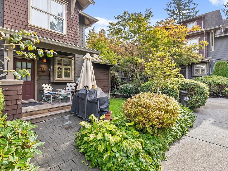 Welcome to this bright and updated corner townhome in one of New Westminster's most sought-after communities. Steps from Royal Square, Queens Park, and the Aquatic Centre. Situated on 2-levels this home offers a lifestyle of ease, access, and everyday comfort. The functional, thoughtfully designed layout features two bedrooms, full bath, and laundry above the main, with an updated kitchen and eating area thoughtfully separated from the open living and dining space, The end unit orientation brings in extra natural light and includes a covered balcony and yard space. Secure parking and storage included. Located in a desirable school catchment, in a walkable neighbourhood with daily conveniences and a well-run complex. Open House Sat OCT 11th, 12-130pm