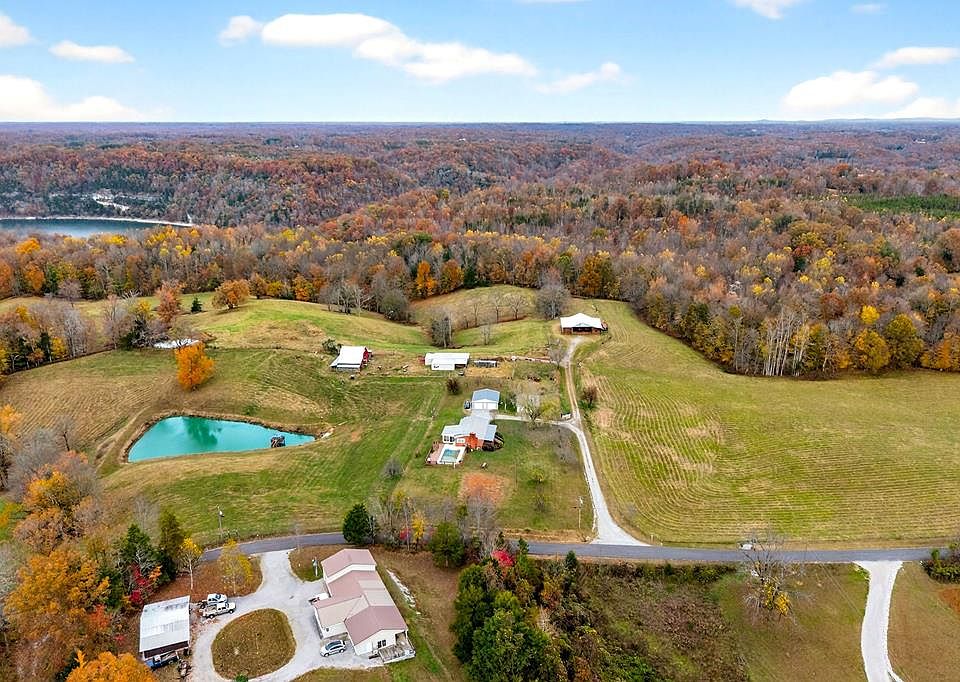 Refreshing swimming poolStocked pondDetached two-car garageLarge barnShop buildingStunning sunroomSerene landscape