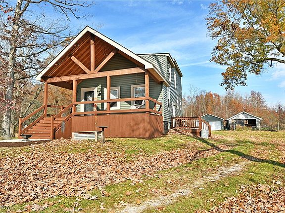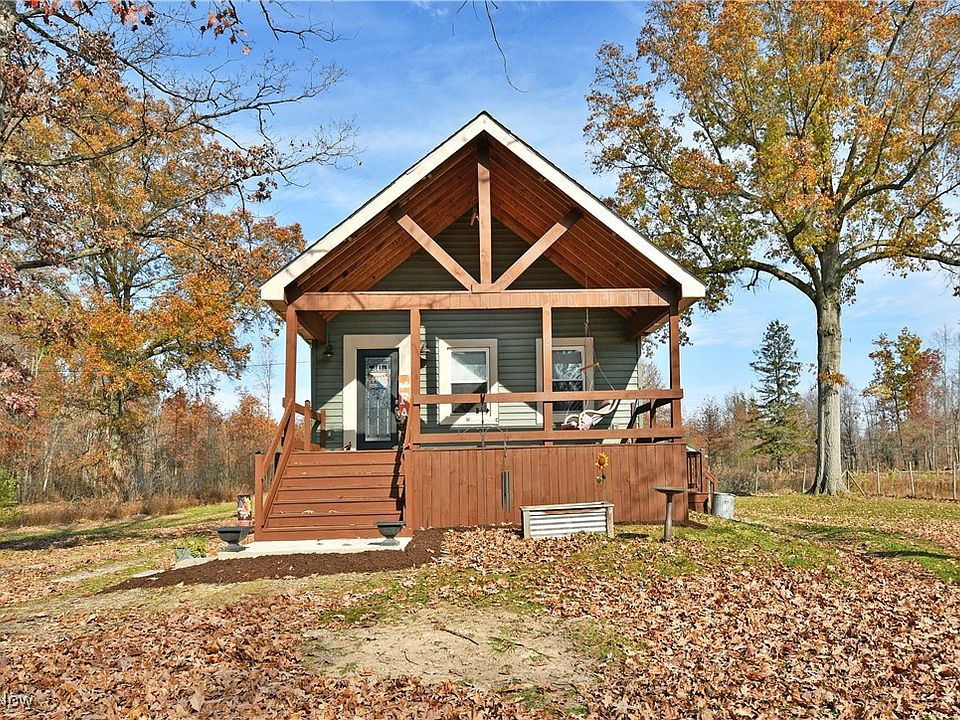 Cozy country living, all wrapped up in tastefully updated modern farmhouse styling; this attractive Champion residence has all the right moves in the right places! Sat deep within an impressively sized lot, the home sits far off the road at the end of a wraparound gravel driveway. A decorative, covered front patio makes for perfect afternoon relaxation as the intricate truss-work welcomes you closer. Meanwhile, a secondary side patio is located before finding the detached two car garage with additional outbuilding. Step through the decorative front door to immerse yourself in the inviting living room as hardwood styled flooring pairs with a blend of warm grays and bright white accent trim. A gorgeous mantle with inset fireplace adorns the near wall as sunlight spills through multiple windows. Crossing a short hall where the stained wood main staircase is seen, the gracious kitchen opens to reveal plenty of combined dining space that overlooks the sleek, tiled backsplash and stone look countertops. The charm continues as you make your way down the near hall, opening with a lovely full bath, highlighting its rustic cues. Continuing, first floor laundry and storage space sits before the oversized first floor master bedroom. On the second floor, the expansive landing includes a fantastic lounge area. A pair of sizeable bedrooms exude style as they reside at the far ends of the floor. Completing the package is a must-see full bath with its raised soaking tub and combined shower. Down below, a full basement offers easy storage solutions. Updates include roof 2020, windows 2018, septic 2019. The covered front deck was just done 2024!