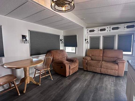 This Park Model home in Rock Shadows RV Resort, Apache Junction, AZ, features a cozy living room, a small dining area, a comfortable master bedroom, and a functional kitchen. The home also includes a carport for parking convenience. Inside, the home is equipped with essential appliances such as an oven, fridge, and hot water heater for everyday living. Home shows pride of ownership!Rock Shadows, offers residents a range of amenities including a clubhouse, swimming pool, and recreational activities. The community is known for its scenic views of the Superstition Mountains and proximity to hiking trails and outdoor activities. Residents can enjoy a peaceful and active lifestyle in this welcoming community in Apache Junction, AZ.