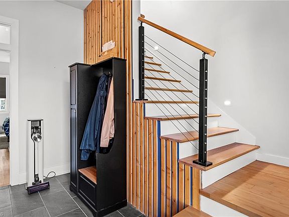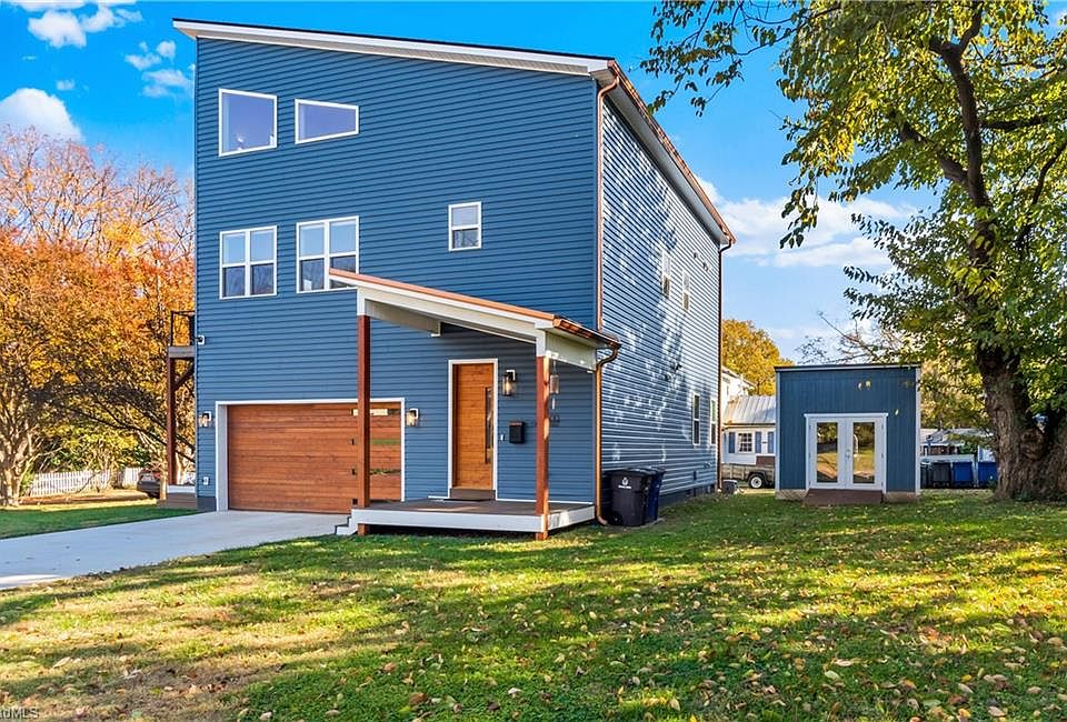 This exceptional property boasts a prime location with convenient access to downtown, hospitals, shopping, and major highways. The uniquely designed contemporary home, constructed just two years ago, features an open layout with sleek lines and soaring volume ceilings. The main level includes a den with a kitchenette which opens to a deck, a bedroom, and a full bath, while the upper level encompasses the primary living space. This area features living room and dining room that seamlessly open to a spacious deck offering city views. The thoughtfully designed kitchen with an island and ample cabinet space, the primary suite with large walk-in shower also provides access to the upper level deck. The loft area presents numerous possibilities. Additionally, the property includes an attached garage and a detached heated storage building measuring 12x10 for extra storage needs.