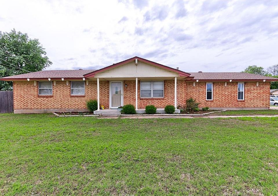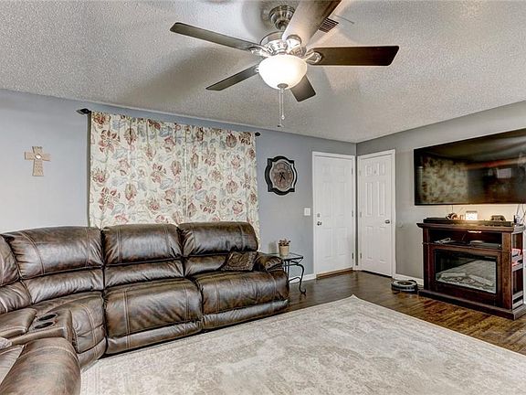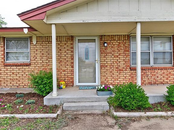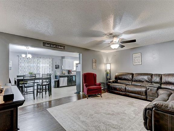 Open floor plan with several updates. Carpet installed in April 2019. Hand scraped laminate flooring in living area, 4th bedroom and hallway. Tile in dining room and kitchen. Converted garage is being used as 4th bedroom/office space but can be used as 2nd living area. Newer stainless steel appliances. Stove is electric but gas hook-up is available. 10-12 person storm shelter in detached garage floor. Covered back patio with patio door installed April 2019. Spacious corner lot. Close to shopping and entertainment.