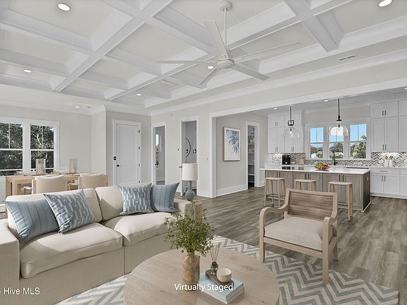 Welcome to the Coresound Cottage by Channel Marker Builders! This exceptional coastal retreat, where luxury design and functional elegance come together to create the perfect waterfront home. This 4-bedroom, 2.5-bathroom residence features a reversed floorplan, thoughtfully designed to maximize space, comfort, and breathtaking Intracoastal Waterway views. The first floor is dedicated to comfort and convenience with three well-appointed bedrooms and convenient access to the laundry room. Two spacious bedrooms share a beautifully finished full bath with a linen closet, while the primary suite offers gorgeous water views with walk-out PGT slider door and primary ensuite featuring a custom-tiled shower with frameless glass enclosure and Moen U, a double vanity, a water closet, a linen closet, and two large closets for ample storage. Ther are two enclosed garages open to a conditioned mudroom entry and a large conditioned storage area, with a three-stop elevator and interior staircase connecting all levels for added convenience. The second floor is the heart of the home, designed for entertaining and relaxation. A spacious living room with 16-foot PGT sliding doors with stunning water views, welcomes in natural light and provides access to the outdoor living spaces, creating a seamless indoor-outdoor flow. The dining area and kitchen are equally impressive, featuring trey ceilings, 10-foot ceilings with 8-foot doors, and a gourmet kitchen equipped with a gas cooktop, a stainless apron sink, a walk-in pantry, and a stunning 18x13 island. A private fourth bedroom on this floor adds flexibility, whether for guests or additional living space or office, while a half bath completes the second-floor layout. Outdoor living is just as remarkable as the interior, with custom stainless cable handrails on the decking, a private pool, and a boat slip that provides direct water access. The home is surrounded by beautifully irrigated landscaping, adding to the serene coastal ambiance