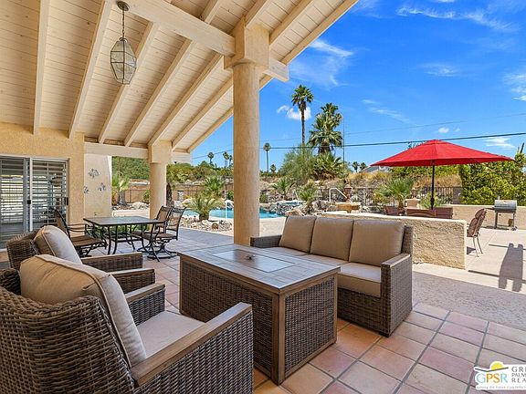 Premier location, panoramic mountain views, and exceptional pride of ownership! Welcome to 600 West Via Escuela, a one-of-a-kind 4 bed, 4 bath gated residence tucked away in the highly coveted Chino Canyon neighborhood of Palm Springs. Just minutes from scenic hiking trails and the vibrant shops, dining, and entertainment of Downtown Palm Springs, this custom home delivers a rare blend of privacy, style, and substance. Inside, soaring ceilings and expansive windows frame dramatic mountain views from nearly every room, while the open-concept floor plan creates seamless indoor-outdoor flow ideal for both everyday living and entertaining. The recently renovated gourmet kitchen is a true showpiece, boasting a vaulted ceiling, custom cabinetry with accent lighting, marble-accented solid surfaces, a dramatic 9-foot island, and a premium Sub-Zero and Wolf appliance suite including a 48" dual-fuel range with grill and griddle, multiple ovens, warming drawer, and Sub-Zero wine refrigerator. Two Bosch dishwashers, a walk-in pantry, and a separate laundry room enhance functionality, while the adjacent family room with gas fireplace and mountain views opens to a covered patio, built-in BBQ, and private pool and spa. Thoughtfully designed for comfort and versatility, the home features TWO spacious primary ensuites located on opposite ends of the residence each with mountain views, walk-in closets, private baths, and direct access to the backyard. Primary Suite One also features split vanities, a large walk-in shower, a soaking tub with mountain views, and a private water closet with an additional sink. Primary Suite Two also offers direct access to the backyard, with its private ensuite bath offering a second opening to the pool area. Junior Ensuite Three and Four each enjoy their own private baths, with Junior Ensuite Four currently styled as a home office offering stunning views. Outside, the private backyard offers multiple entertaining areas, a renovated Pebble-Tec pool and spa with newer PentAir equipment, and ample space to expand. Additional upgrades include two newer Trane HVAC systems with updated ductwork, 24 solar panels, a LifeSource whole-house water purification system, and an oversized three-car garage with built-in cabinetry. Additional gated guest parking, too! There's no HOA, no land lease, and the home is eligible for both short- and long-term rental use. 600 West Via Escuela is a rare opportunity to enjoy elevated desert living in one of Palm Springs' most sought-after neighborhoods.